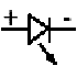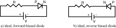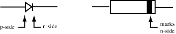 A semiconductor diode, or a p-n junction diode, looks similar to a resistor, but act very differently. It has a band at one end, which marks the n-side of the p-n junction. The symbol points in the direction that conventional (positive) current would flow.